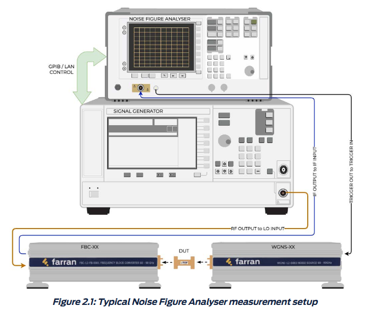 Farran公司的扩频模块WGNS-XX和FBC-XX-FB应用于噪声分析仪扩展,可支持Keysight公司的NFA与PXA系列仪表。WGNS-XX是噪声源系列,FBC-XX-FB是噪声下变频接收机系列。该测试系统可实现待测电路以及器件的噪声分析,并可配置前置预选放大器,极大的降低整套系统的整体噪声。