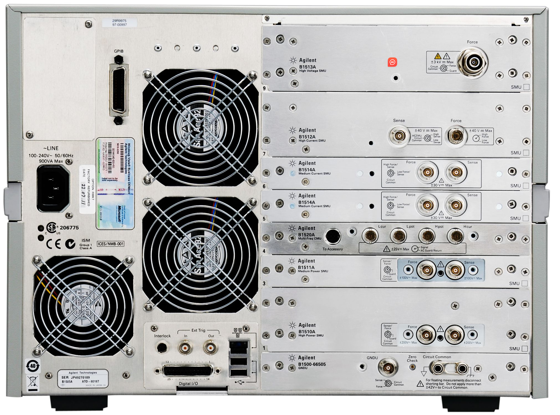 B1505A 支持多种模块:高压 SMU(HVSMU)、大电流 SMU(HCSMU)、超高电流(UHC)模块、超高压(UHV)模块和高压中电流(HVMC)模块。 B1505A 还支持大功率 SMU(1 A/200 V)、中功率 SMU(100 mA/100 V)、中电流 SMU(1 A/30 V 脉冲、100 mA/30 V 直流)和多频电容测量单元(1 kHz 至 5 MHz)。 其 10 插槽模块化主机让您能够灵活配置 B1505A,更好地满足测量需求。